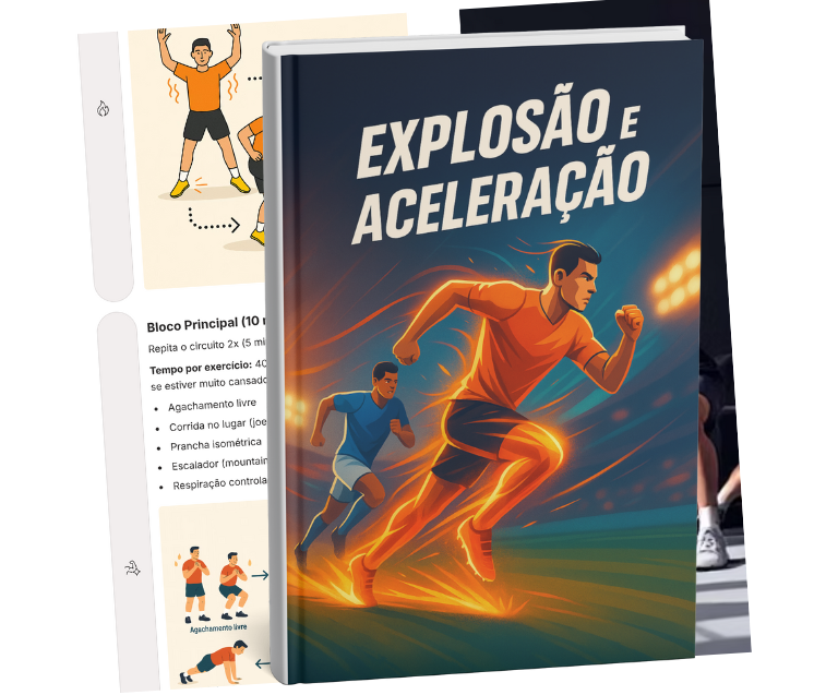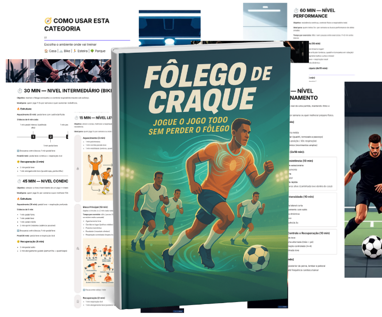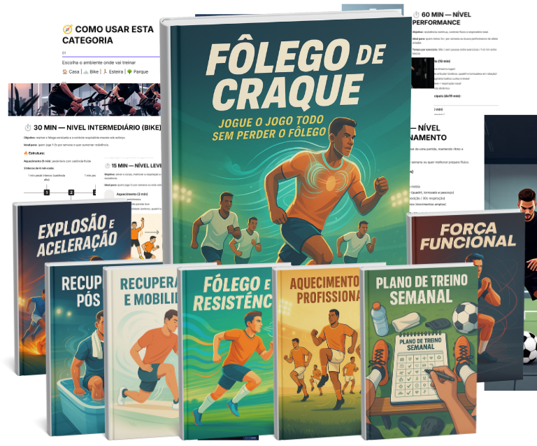 +50 rotinas de treino curtas e inteligentes, criadas para melhorar fôlego, explosão, força e controle físico com apenas 15 minutos por dia.